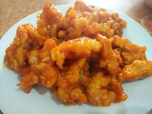 放入炸好的肉条小火翻炒,让每块肉都包裹上酱汁。 酱汁倒入锅中大约10秒就调制小火,在酱汁还没有煮的很粘稠的时候放入炸好的肉条,这样酱汁就可以把肉条全部包裹住。
