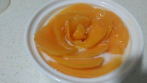 把芒果切片,摆花型,我是先放在小口瓶里摆好再挪到布丁上的。
