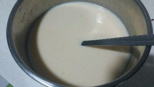 然然后加入牛奶,白糖煮开,煮开后加入打好的蛋清