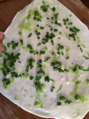 在摊开的面上涂上一层油,撒上葱花,如图卷起来。