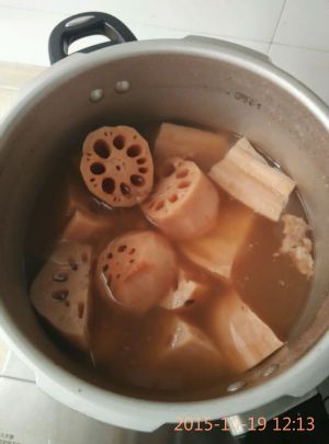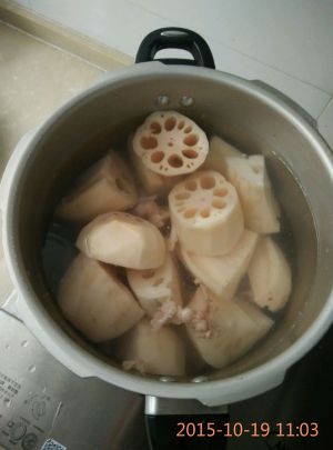 藕直接切成块,大块一些,连骨一起放入高压锅。(水8~10碗)视料多少,我碗较适中。