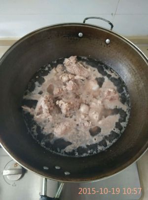 莲藕去皮,切片;排骨先放入滚水中煮一会儿,然后会清水冲去浮沫;