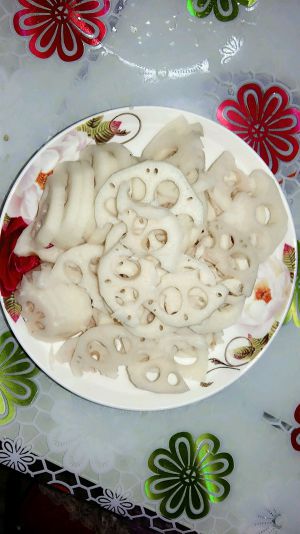 将猪排洗净剁成块状;莲藕洗净去皮切成厚片;小油菜洗净待用
