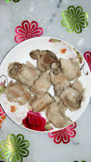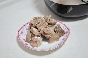 趁煮开将排骨捞出,用热水冲洗干净备用。