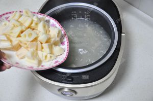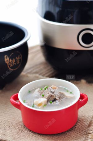 剩半小时时放入切成滚刀块的莲藕继续煮至莲藕发面,盛出调适量盐撒葱花装饰即可。