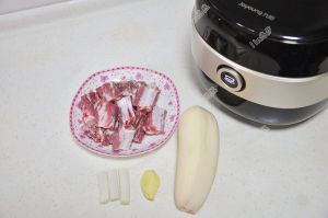 1.凉水里放姜片、料酒、排骨,把排骨焯出血沫。