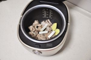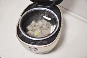 2.把焯好的排骨放在电饭煲里,加上热水,选择煮饭模式,炖煮一小时。