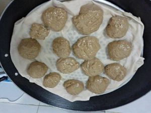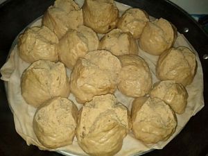 锅里放水,吹布浸湿,铺在吹架上,把醒好的面团搓成一个圆圆的面团,哈哈,这时候更像一坨翔!^O^(搓小团的时候手可以沾些水,面团就不会太粘手)