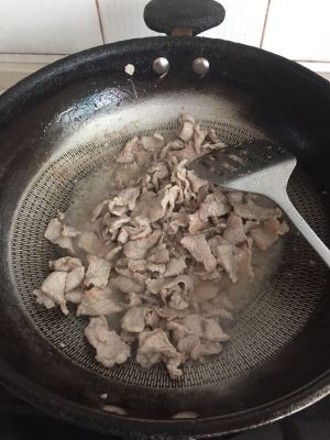 放猪油,八分热,放肉片炒散。变色后,翻炒约7一8秒,放盐3克继续翻炒。