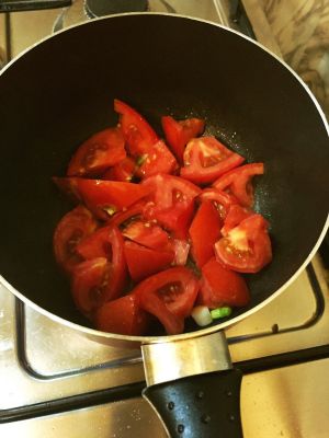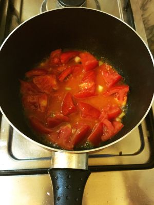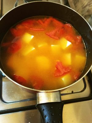 下番茄翻炒片刻,番茄炒出汁之后,加一碗清水。 待水煮开之后,加入豆腐。