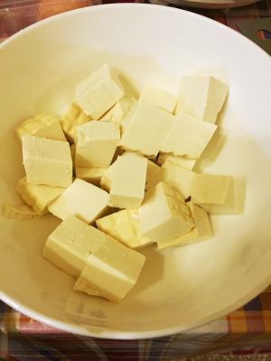 豆腐放入加了盐的沸水略煮,这样可以去除一些豆腥味