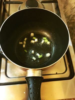 豆腐切块,番茄切块,大葱只需要把葱绿的部分切成葱圈,姜切末。热锅,少许油,爆香葱姜。
