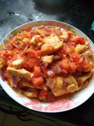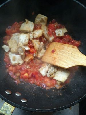 再加入煎好的豆腐炒一炒再把剩下的三分之一的番茄加进去炒一炒 炒匀就差不多不用炒很久
