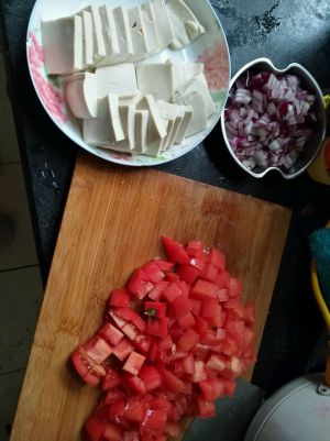 豆腐切块可以稍微厚一点,看自己心情,洋葱切碎,番茄切小块