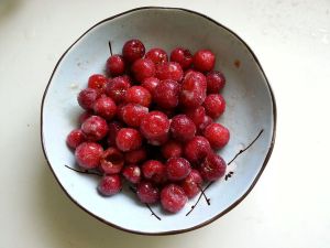 两小时后樱桃会出些之,然后把腌制出来的樱桃汁过滤出来,在加入清水,是重量达到120克即可,最后在加入淀粉15克和8克柠檬汁以及剩下的25克糖,放到火上不加热至沸腾,直至汤汁浓稠,趁热将汤汁倒在樱桃上,等到樱桃冷却即可。