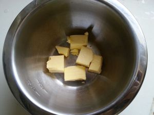 在黄油里加入130克低筋面粉和25克细砂糖。