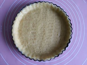 在派盘底部用叉子叉一些孔,以防止烤的时候底部鼓起。入烤箱,中层,190度烘烤,至派皮表面微黄,质地酥脆(约需要25-35分钟)。烤好的派皮冷却后,填入馅料即可。