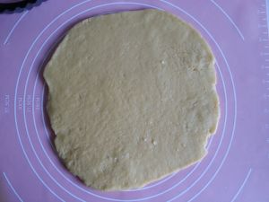 将松弛好的面团擀开约3mm左右,放入28cm的圆形模具中(多余的面团放一边)