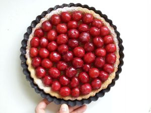 烤好的派皮放到自然凉的温度后放入樱桃。放入樱桃后尽量尽快吃掉,放的时间太久了,派皮就不那么脆了。