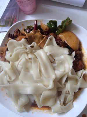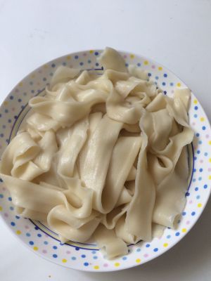鸡肉吃的差不多了,就可以下皮带面了,我今天是买的面剂子,