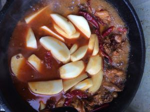 闷煮了大概二十分钟,出锅之前加入红辣椒,青辣椒,和一点鸡精继续翻炒(时间不定这要看你食物的大小来定时间,自己把握)