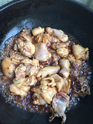 料酒腌制好的鸡肉,到油煸炒一下倒入酱油,在炒至变色、加开水,香叶,大料…小火炖着