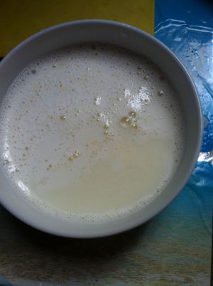 蛋清和牛奶充分搅匀过滤一遍,再沿着碗的边缘倒回奶皮碗中。