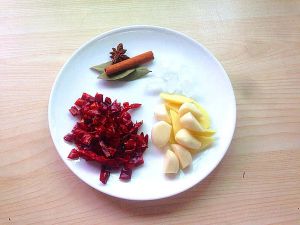 再来准备配料:少许干辣椒段儿,大蒜生姜块,八角桂皮,香叶