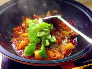 放青椒,红椒,洋葱块。焖3-5秒。出锅前撒上香菜碎。