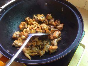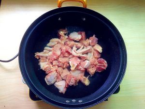 加入鸡块翻炒上焦糖色