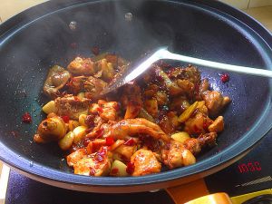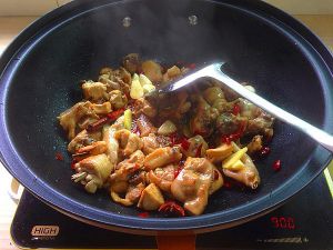 葱姜蒜下锅爆香,下鸡块炒至变色。放干红椒,冰糖炒干水份。有点微焦。