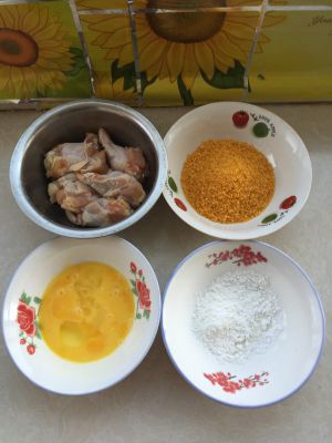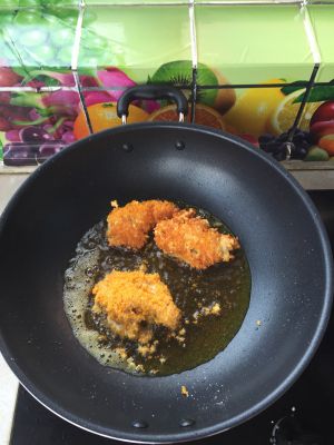 先裹一层鸡蛋液,然后淀粉裹均匀,在裹一层鸡蛋液,最后裹上一层面包糠,一定要裹厚厚的哦,这样炸至出来才能更酥脆哦……