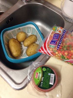 土豆蒸熟 搗成泥。雜菜煮熟。火腿切丁。加色啦醬。攪拌均勻。