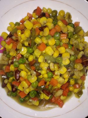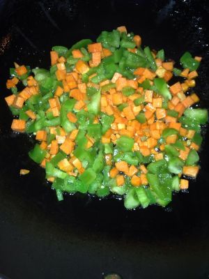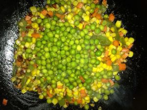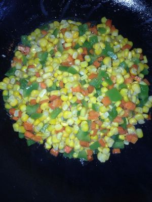 锅中烧油,倒入胡萝卜,玉米粒,豌豆粒,放入一丢丢盐,快速翻炒
