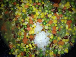 揭盖,加入豌豆,胡萝卜丁,玉米粒,盐1/2茶匙,白糖1茶匙。合上锅盖,开始烹饪。