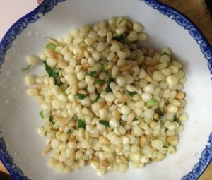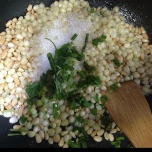 松仁炒香后加玉米糖 葱 芫荽快速翻炒