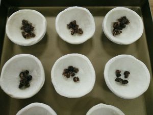 将蛋液倒入挞皮,八分满就可以了,用蛋液将葡萄干淹没。
