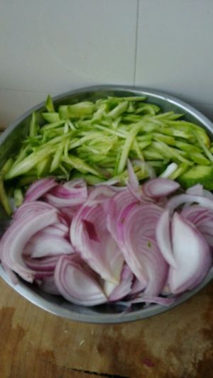 黄瓜,圆葱,肉,切丝备用。