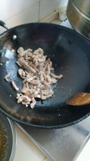 锅预热少于油加肉炒熟。