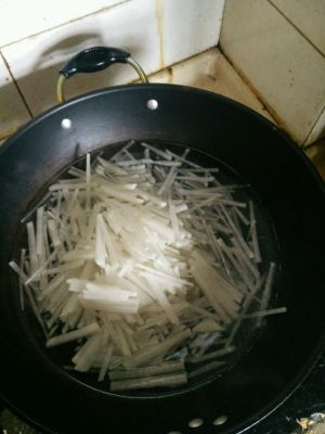 心里美萝卜切丝,倒入凉水锅大火烧开。(水宽一些)