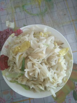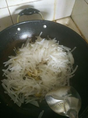待泡椒炒出汁后,加入煮好的萝卜丝进行翻炒,然后放盐,出锅