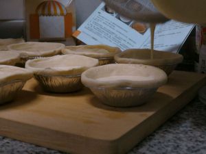 将挞液过筛盛入挞皮中。