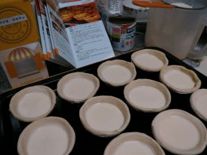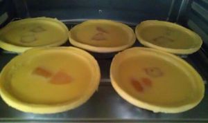 蛋挞水加黄桃或者红豆倒入蛋挞皮中八分满…