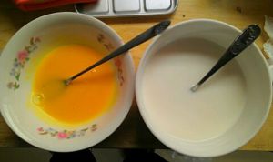 取一只奶锅把牛奶,炼乳,糖,倒入加热,不可沸腾!糖化了就要关火了(这里需要注意,不爱吃甜太甜的可减5~10g糖!我家爱吃甜,所以我加的多)晾凉,2个蛋黄加入继续搅拌如图。烤箱200度预热10分钟。