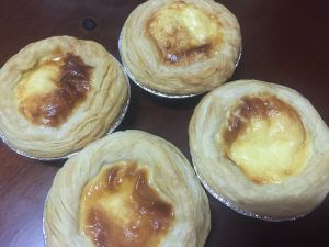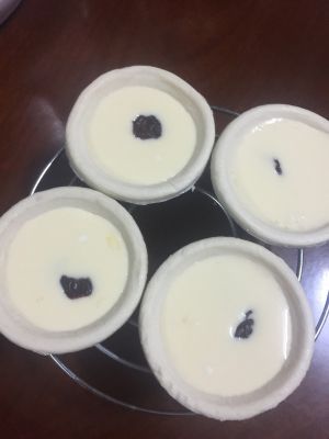 蛋挞液倒入蛋挞皮中,约9分满,放入预热好的烤箱中层,上下火200度烤20分钟左右