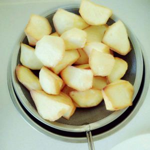 地瓜切成滚刀块,过油炸透,捞出待用。