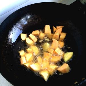 倒入适量的色拉油,待油热后,倒入切好的地瓜,炸止地瓜变软,成金黄色,盛出备用。