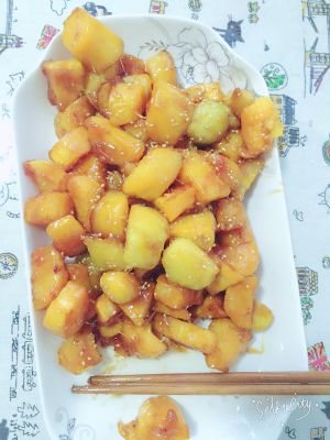 炸好的地瓜备用,起锅加入水,白糖,一小勺油,熬糖没来得及拍照,小火儿慢熬,糖变焦糖色就熬好了,倒入地瓜,翻炒两次即刻