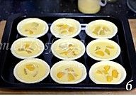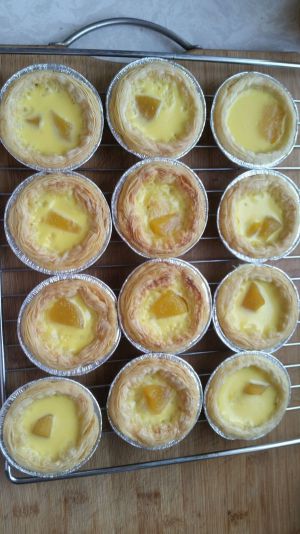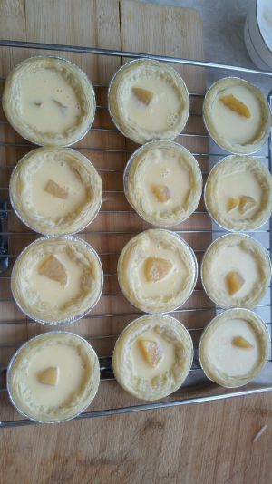 倒入挞皮中,半分满,然后加入黄桃果肉,烤箱预热,190度上火,置于烤箱中下层,烤制18-20分钟即可。