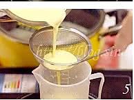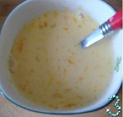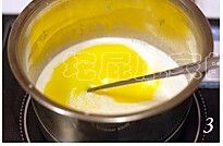 第三步,三个蛋黄搅拌成液体,然后牛奶液放凉并加入蛋黄液,搅拌均匀